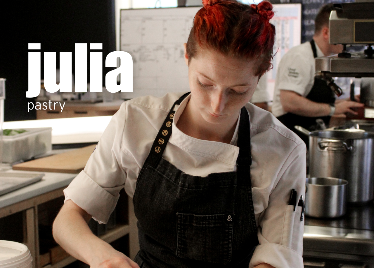 Her days begin early, with the quiet of the kitchen as her canvas. She balances long projects like steeping and setting with countless smaller tasks, multitasking to bring every sweet moment of minibar’s menu to life. While Julia treasures the stillness of the early hours, when the kitchen is hers alone, there is nothing like the spark of energy that fills the room as the PM chefs arrive, bringing the space to life. That shared passion and focus of one mission, one team, one dream, fuels her creativity and keeps her thriving in an environment that demands nuance, playfulness, and precision in equal measure.
